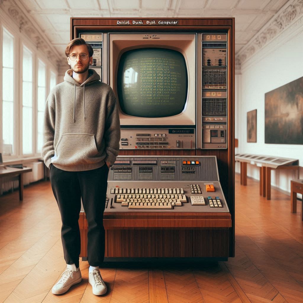 Den originale DASK – Dansk Aritmetisk Sekvens Kalkulator , og et AI billede af en ” person foran DASK ” danmarks første computer.